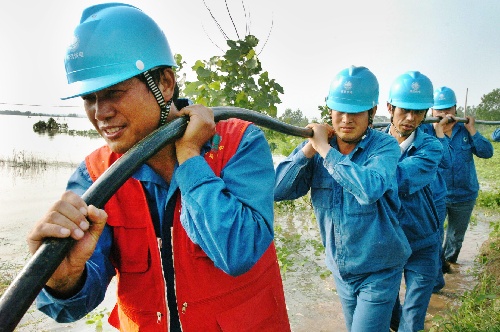 懷遠(yuǎn)(安徽),2007年7月21日 為災(zāi)區(qū)群眾送電 7月21日,安徽省懷遠(yuǎn)供電公司的電工在災(zāi)區(qū)鋪設(shè)電纜。 當(dāng)日,安徽省懷遠(yuǎn)供電公司接到上級命令,為因荊山湖分洪造成電力中斷的災(zāi)區(qū)群眾送去電能。他們在災(zāi)區(qū)臨時鋪設(shè)了低壓電纜1800米,對遭損壞的進(jìn)戶線路進(jìn)行改造、檢修,使處在行洪區(qū)內(nèi)的四個村莊的1200戶群眾及時用上了電。